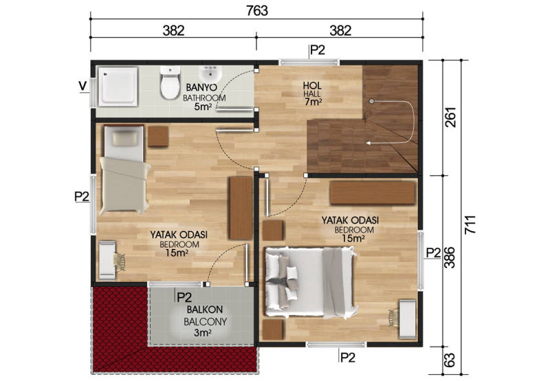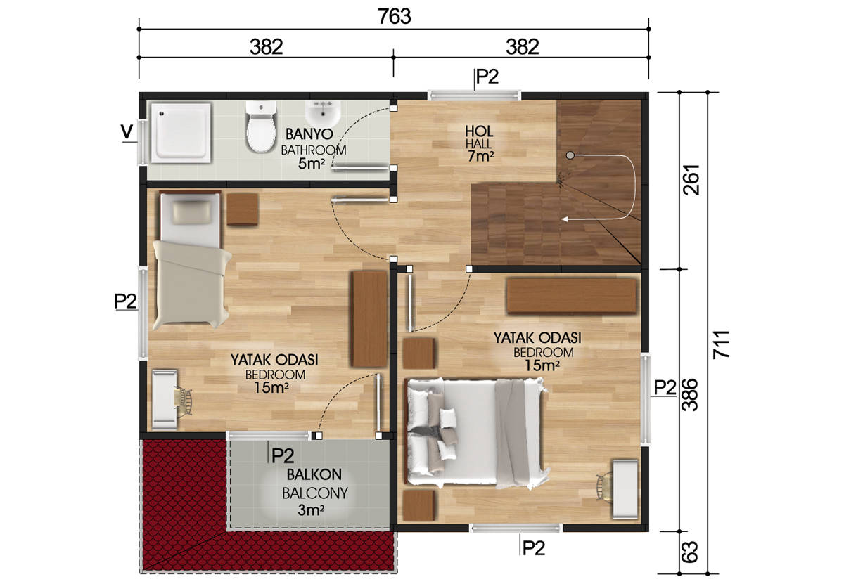 100 m² çift katlı prefabrik konut genel olarak yazlık bölgelerde tercih edilen projelerden biridir.