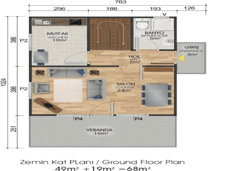 119 m² Çift Katlı Prefabrik Ev konforlu bir yaşam ihtiyacını karşılayabilmektedir. Bu evlerde zemin katta genellikle mutfak, salon ve banyo, tuvalet bulunmakta, üst katlarda ise yatak odaları yer almaktadır. Yapımı kolay ve pratik, aynı zamanda da ekonomiktir.