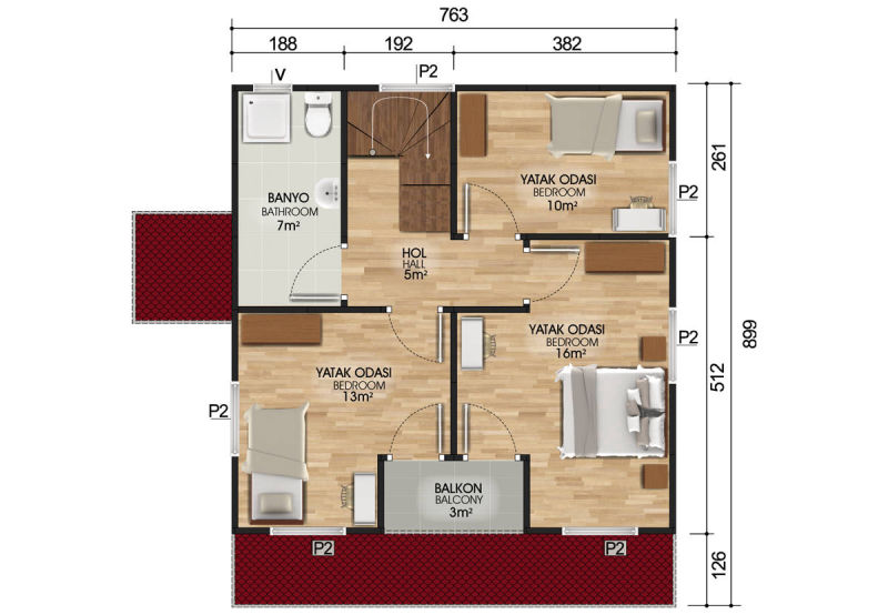 İşte bu bilgilerden yola çıkarak prefabrik bir ev arayışına girenler için 131 m² Çift Katlı Prefabrik Ev modeli hakkında size bilgi vermek istiyoruz. 131 m² Çift Katlı Prefabrik Ev de 5 m2 lik bir antreye girilmekte ve antreden salon, mutfak ve banyoya geçilmektedir. Salonun ayrıca verandaya çıkışı vardır. Üst katta 2 büyük 1 küçük yatak odası ve bir banyo ile küçük bir balkon bulunmaktadır.