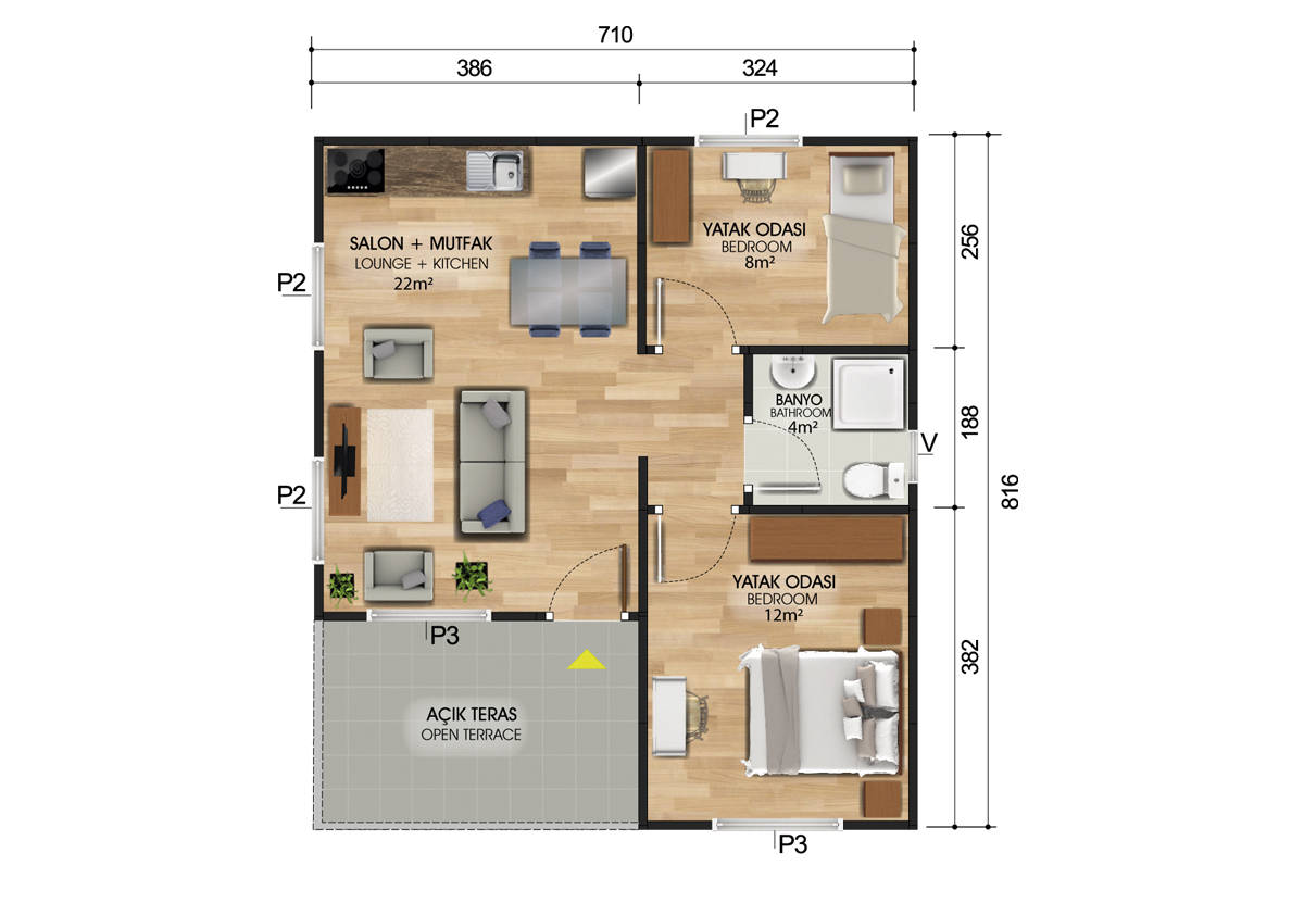 49 m² prefabrik evin özellikleri bunlarla da sınırlı kalmıyor. Planda gördüğünüz açık teras bölümü evin ölçüleri dışında tutulmuştur. Sizler zemin betonunu buna bağlı olarak attırırsanız otomatik olarak açık bir terasa sahip olacaksınız veya kapınızda sevdiklerinizle oturup çayınızı kahvenizi yudumlayacağınız 11 m² bir veranda ekleyebilir evinizin büyüklüğünü 60 m²’ye çıkarabilirsiniz.