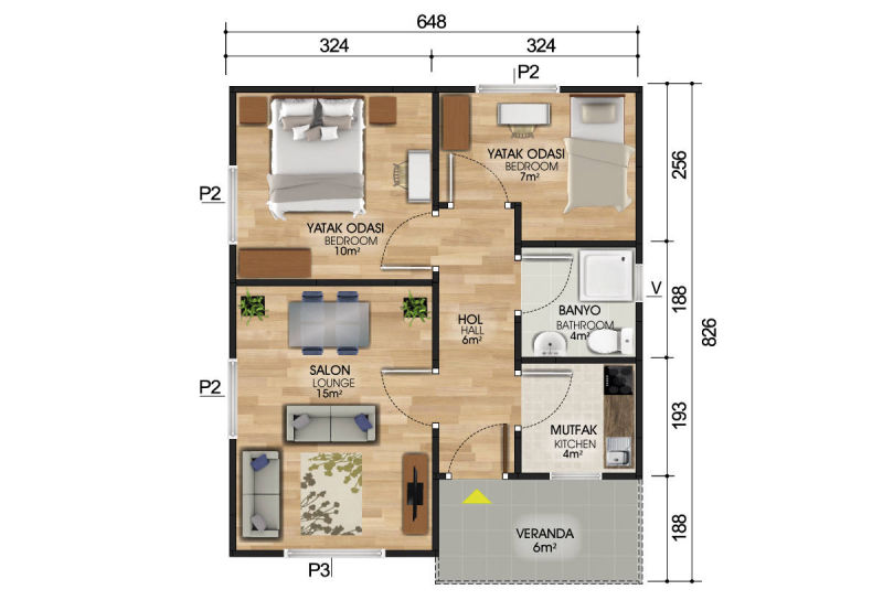 53 m² prefabrik konutun iç planına göz atacak olursak evimiz giriş bölümünde sizlere 6 m² bir veranda ile merhaba diyor. Binanın dış çelik kapısından içeri girildiğinde sağ kapı 4 m² bir mutfağa ve mutfağın karşısında yani 53 m² prefabrik evin sol kısmında bulunan kapı ise 15 m² bir salona açılıyor. Salondan çıkıp 6 m² olan holden gezimize devam edersek mutfağın yanında 4 m² banyo + tuvaleti birlikte göreceksiniz. Salonun yanında, evin arka tarafında 10 m² bir oda ve hemen yanında da 7 m² olan diğer odayı göreceksiniz.
