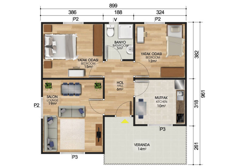 84 m² eviniz sevdiklerinizle hoş vakitler geçirebileceğiniz 14 m² büyüklüğündeki (prefabrik konut) geniş verandası ister mangal keyfinizde sizlere eşlik eder, ister demli bir semaver çayında ailenizle güzel saatler geçirmenize olanak sağlar. 160 X 120 P3 model pencerelerinin ön cephede konumlandırılmış olması da verandanın olduğu bölümde ki 10 m² mutfaktan verandaya pratik servis imkânı sağlamaktadır.