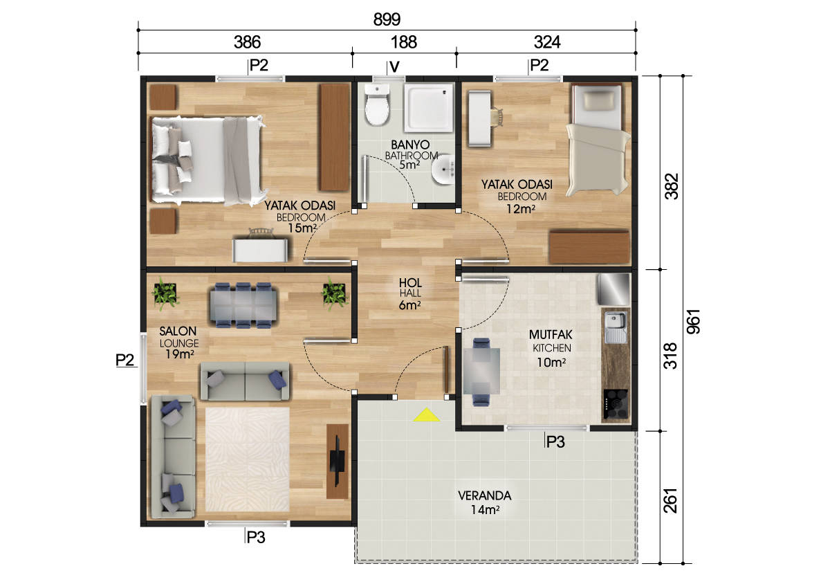 İki adet penceresiyle aydınlık 19 m² bir salonu bulunan evin 14 m² büyük bir odası ve 12 m² de başka bir odası bulunmaktadır. Odaların arasında 5 m² banyo + tuvaleti bir arada göreceksiniz. Yaman Prefabriğin müşterilerine sunduğu fırsatlar 84 m² bu prefabrik konut içinde geçerlidir. Diğer tüm projelerde de olduğu gibi (prefabrik ev) evinizin iç planında, pencerelerinde, kapılarında, dış cephe, iç cephe kaplamalarında, çatısında, boyasında bir prefabrik ev için değişimi mümkün olan tüm alanlarda seçim yapma, değişim hakkına sahipsiniz.