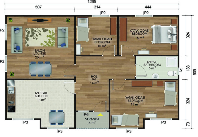 2 m² giriş kapısında ki verandadan giriş ve çıkışlar sağlanmaktadır. Girişin sağında 18 m² olmak üzere bir oda, solunda ise yine aynı şekilde 18 m² alana sahip bir mutfak bulunmaktadır. 14 m² büyüklüğündeki holünüz evinizin oda bağlantılarını sağlamaktadır. Mutfağın arka bölümünde ki 26 m² gayet kullanışlı bir salon ve salonun yanına konumlanmış biri 10 m², diğeri 15 m² iki oda bulunmaktadır.
