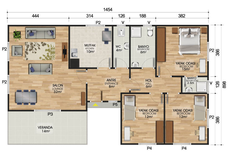 Geniş ailelerin en büyük sıkıntılarından biri olan kullanışlı oda yetersizliğine çözüm olan 123 m² prefabrik eviniz gönül rahatlığıyla misafir kabul edebilmenize de imkân sağlıyor. Çünkü dışarıda yaz kış kullanabileceğiniz büyük bir verandaya, içeride ise yeterli ölçülerde odaları ve geniş bir salona sahip olmasıyla 123 m² prefabrik eviniz siz geniş ailelerin en çok ilgi gösterdikleri projeler arasında yer almaktadır.