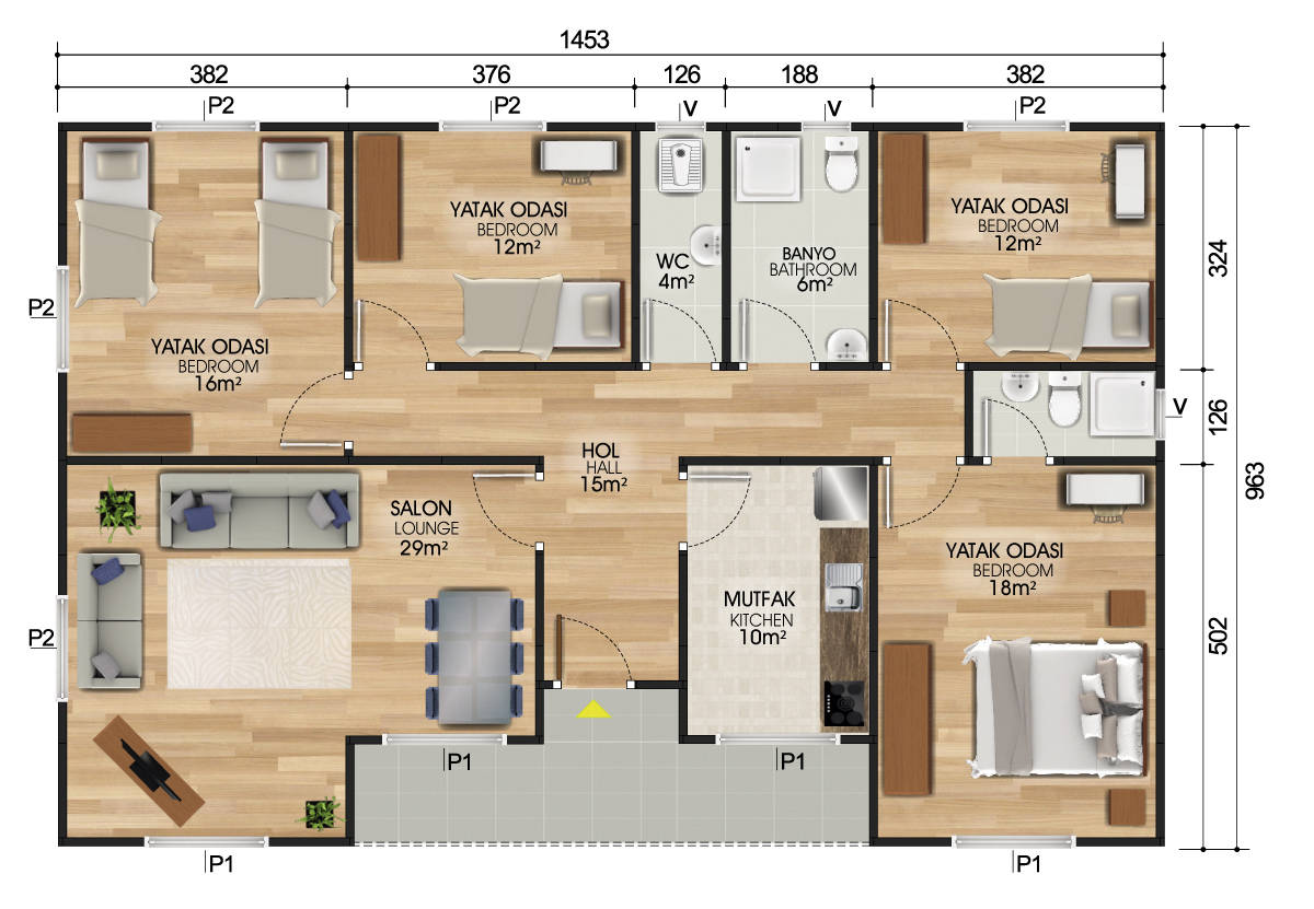 Evin dış çelik kapısından içeri girdiğimizde 17 m² T şeklinde bir holün tüm oda kapılarına ulaşımda yardımcı olduğunu görüyoruz. Girişin solunda bulunan kapı aynı zamanda binanın cumbalarından birini oluşturan 25 m² bir salona açılmaktadır. Salon yemek masası ve oturma alanı bakımından fazlasıyla kullanışlı bir biçimde tasarlanmıştır. Salonun karşısında 10 m² mutfak konumu itibariyle 129 m² prefabrik evinizde kolaylık sağlamaktadır. Mutfağın hemen yanında modüler evin en geniş odası olan 16 m² ebeveyn banyolu bir yatak odası bulunmaktadır.