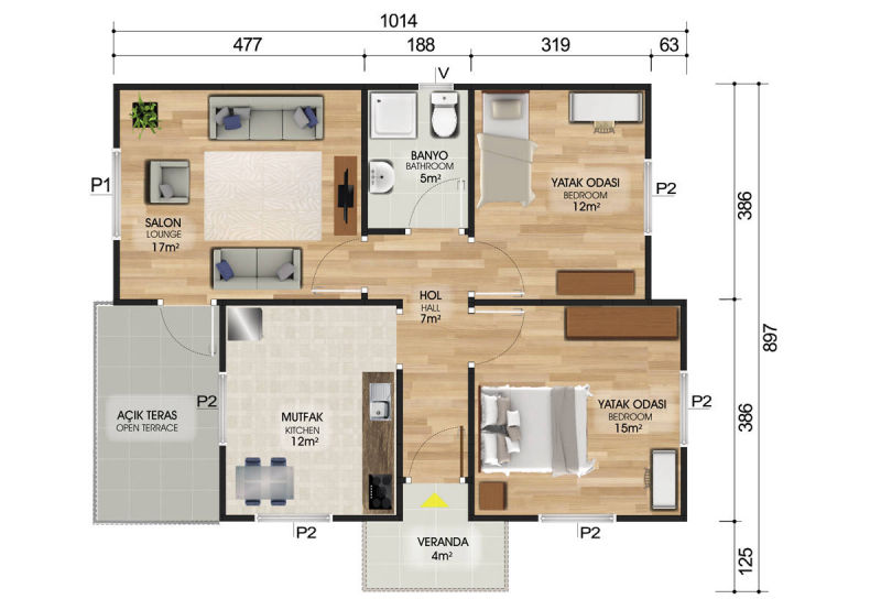 Bahsi geçen proje VP538 adlı 72 m² prefabrik konuttur.72 m² 2 + 1 bu prefabrik konutun en büyük özelliği açık teras, salon ve mutfağın birbirlerine yakın uyumudur. Dilerseniz prefabrik evin iç planına şöyle bir göz atalım.